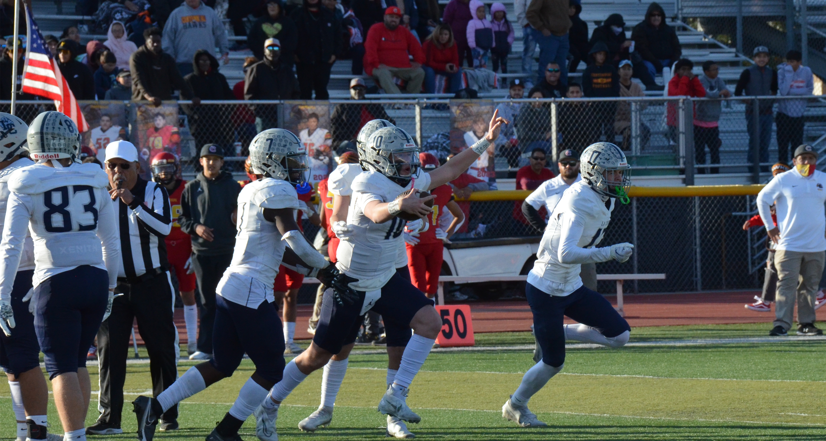 La Cueva put together two of the most impressive game winning performances on Saturday to finish the 4th quarter strong. After the Bears Defense forced a Hawks punt, Aiden Armenta took over with 6 1/2 minutes left in the game on the Bears 14 yard line. Senior running back, Gabriel Buie, chewed up yardage and clock scoring from 1 yard out on the 13 play, 86 yard drive, that lasted just under 5 minutes leaving Centennial with only 1:35 to work with. Now up 42-35, the La Cueva D got their chance to step-up. And they performed brilliantly! After a few solid Centennial plays, the Bears pass rush started getting into the backfield. On the final defensive play of the game, the D line broke through, hitting the Hawk quarterback and forcing an errant backward pass that the Bears recovered to seal the victory! Fantastic outing Bears! TAKE STATE!
